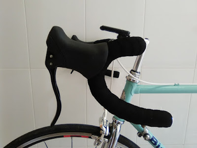 En primer lugar he colocado las manetas de freno clásicas non aero Dia Compe para ver si a pesar de reducir en 4 centímetros la distancia resultaban cómodas. Estéticamente me ha encantado el resultado, pero en la práctica y tras varias salidas he debido cambiarlas, ya que estas manetas están diseñadas para manillares clásicos y en estos tipo compact queda muy oprimida la palma de la mano contra la goma, quedando muy poca zona de apoyo palmar exterior.
